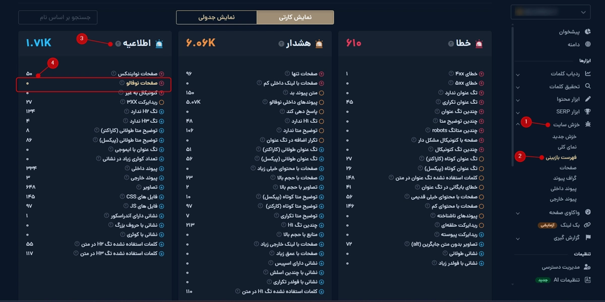 بعد از اتمام خزش، برین سراغ تب فهرست بازبینی؛ اینجا دقیقا جاییه که خطاها و هشدارها و اطلاعیههای مهم سئو جمع شده.