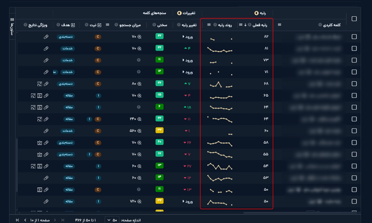 شما اگر عکس بالا رو با دقت نگاه کنید (ستون روند رتبه) متوجه میشید که رتبه کلمات کلیدی در نمودار نوسان کمی داشته و تغییرات کم بوده و حتی میانگین رتبه هم در خیلی از کلمات یک عدد صحیح بوده و اعشاری نیست. پس تغییرات در رتبههای برتر اصولا به خاطر گوگل دنس نیست (البته همیشه اینطور نیست ولی در بیشتر مواقع افت یا رشد رتبه در رتبههای بالاتر ربطی به گوگل دنس نداره)