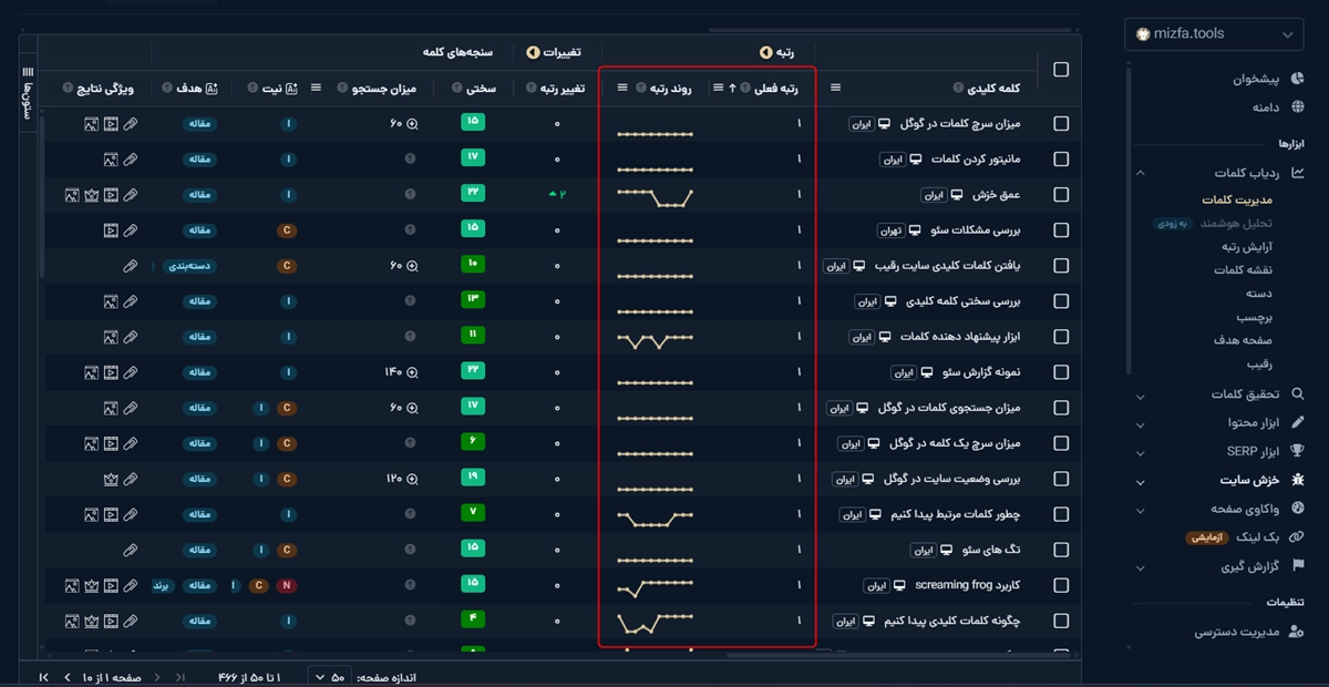 یه روش خیلی سادهتر هم برای تشخیص رقصیدن صفحهها وجود داره. ابزار میزفا تولز، میتونه رتبه فعلی، رتبه قبلی و روند تغییر رتبه سایت شما توی کلمات کلیدی مختلف رو بهتون نشون بده. بنابراین بدون اینکه نیازی به تحلیل ورودیها داشته باشید، تشخیص میدید کدوم صفحهها توی گوگل رقصیدند. توی ویدیو بالا میتونید نمونه اطلاعاتی که میزفا تولز از رتبه شما توی کلمات کلیدی مختلف بهتون نشون میده رو ببینید.