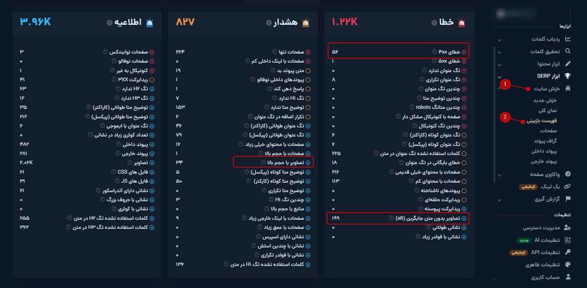 با استفاده از ابزار سئوی ایرانی میزفاتولز میتونید بهراحتی خطاهای مختلف سایت خودتون از جمله خطاهای مربوط به تصاویر (مثل تصاویر با حجم بالا یا تصاویر بدون متن جایگزین) رو شناسایی و رفع کنید.