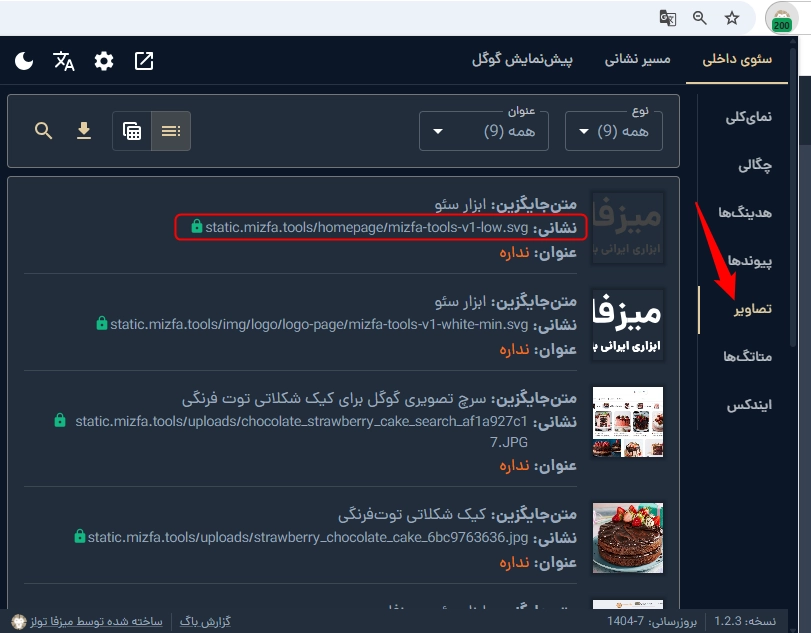 همچنین میتونید با استفاده از اکستنشن سئو کروم میزفا تولز نشانی تصاویر یک صفحه رو به همراه آلت تصاویر ببینید.