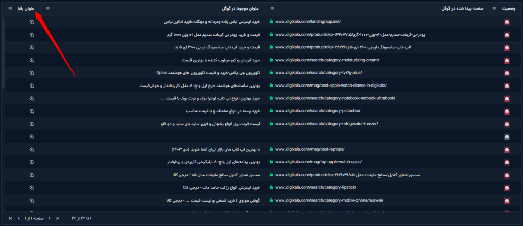 در ستون بعدی، صفحه و عنوان شناخته شده در گوگل رو نمایش میده که این اطلاعات از نتایج گوگل به دست اومدن و همونطور که میدونید چیزی که در سئو اهمیت داره دید گوگل به صفحات ما هست. آدرس صفحه و عنوان صفحهای که اینجا مشاهده میکنید، دقیقا همون چیزی هست که گوگل داره نمایش میده و امکان داره با اطلاعاتی که شما وارد کرده باشید، متفاوت باشه. ❌